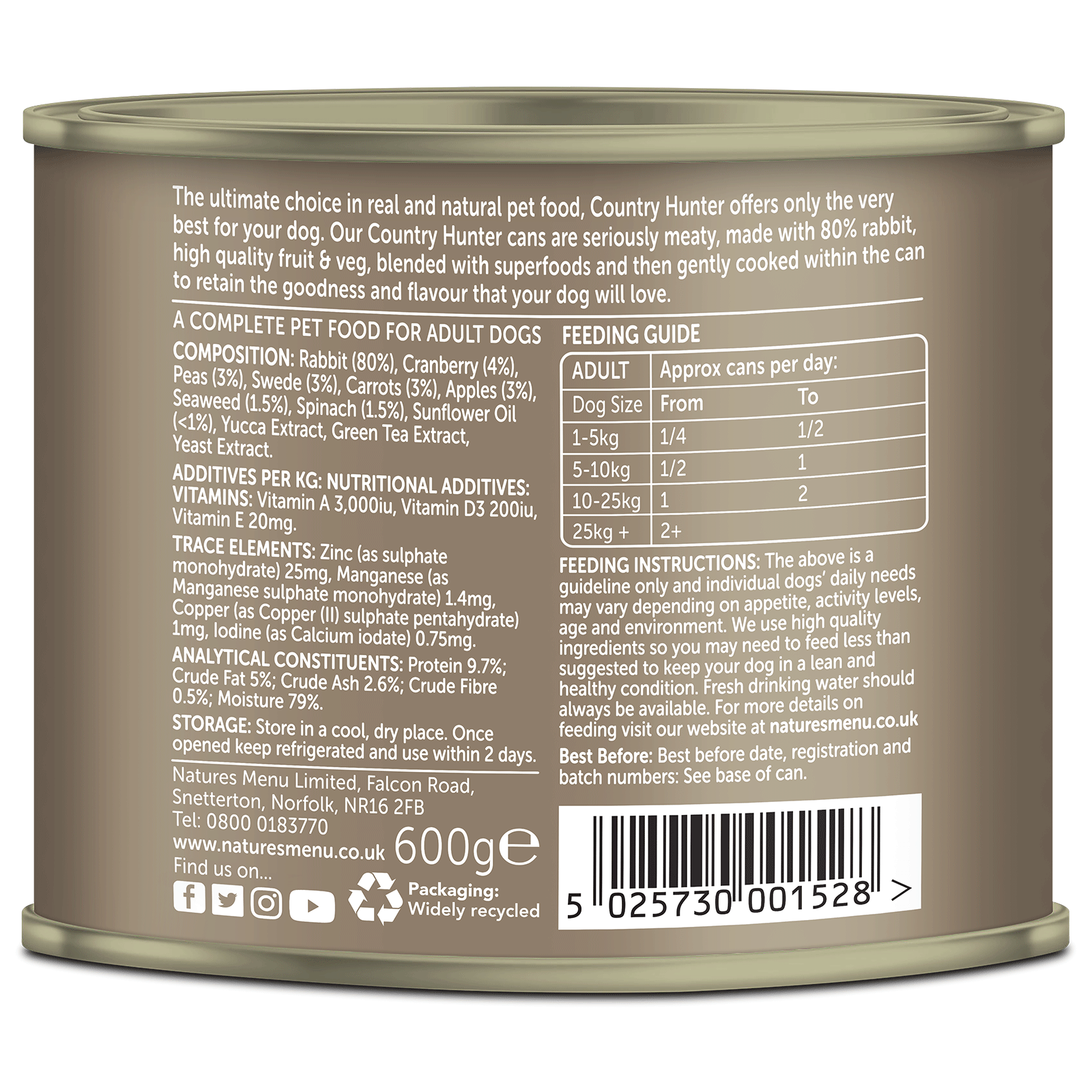 Specifications: 600g can, 80% rabbit, grain-free, complete and balanced, human-grade ingredients.