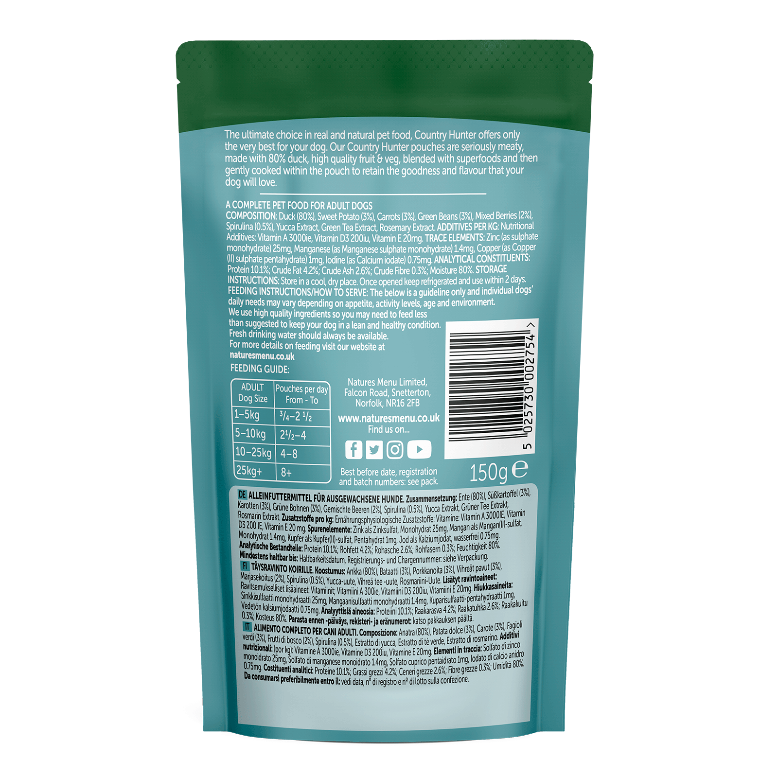 Specifications: 150g pouch, 80% duck, grain-free, complete and balanced, human-grade ingredients.