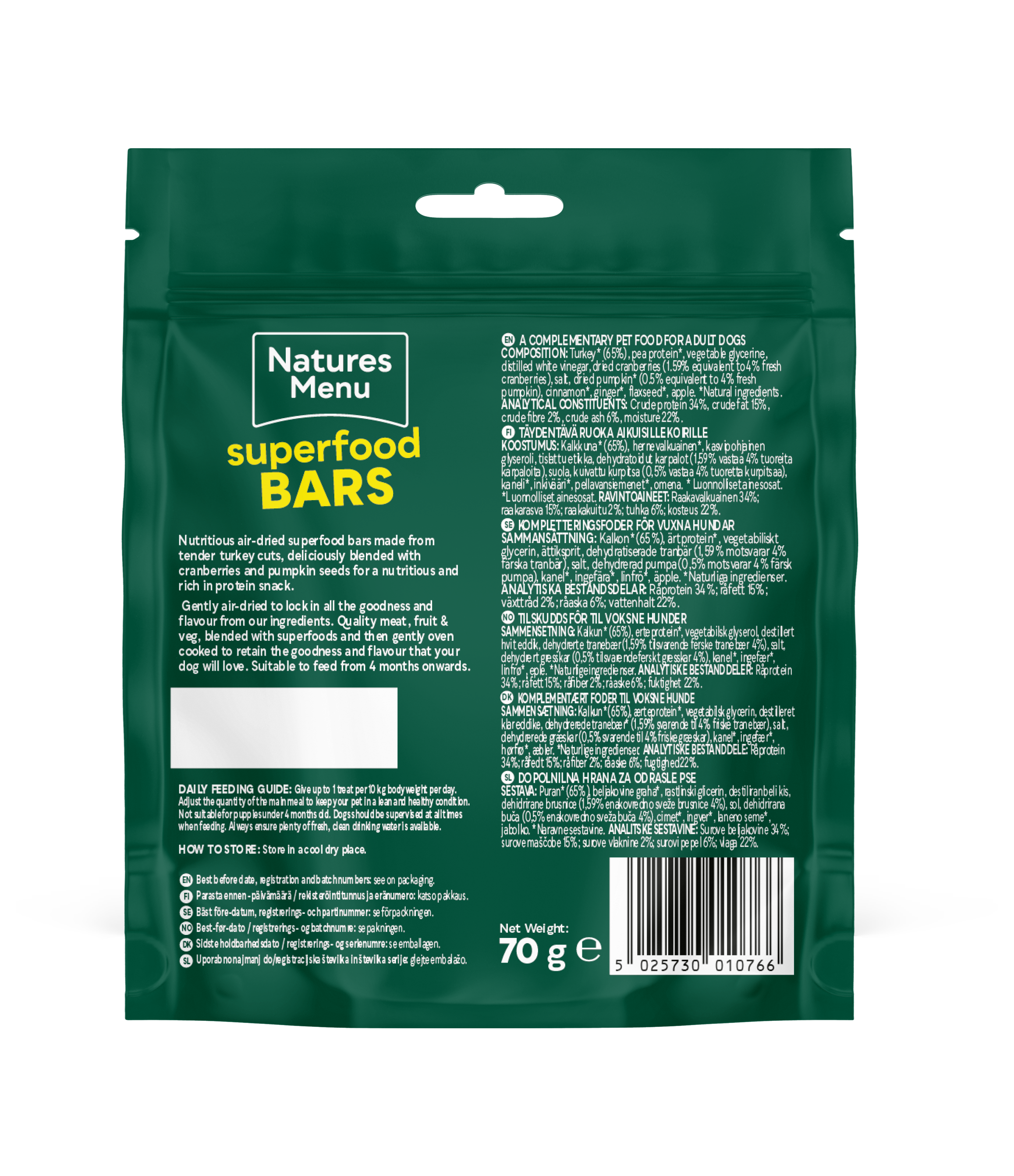 Specifications: 70g bar, turkey with cranberry and pumpkin, superfood enriched, grain-free, natural ingredients.