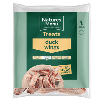 Treat your dog to Natures Menu Frozen Treats Duck Wings! These premium natural raw treats feature 5 pieces of high-quality duck wings, perfect for recreational chewing, dental health, and providing your dog with natural nutrition they crave.