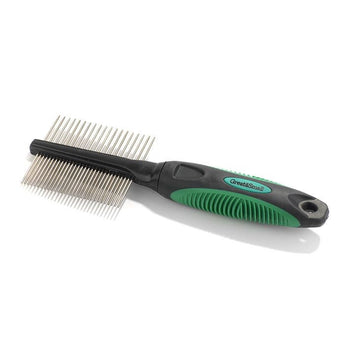 Groom your pet with the Double Sided Comb! This professional grooming tool is designed with ease of use and practicality in mind. With an ergonomic comfort handle and two different tooth spacings, it's great for extended grooming sessions and is also hygienic and easy to clean.